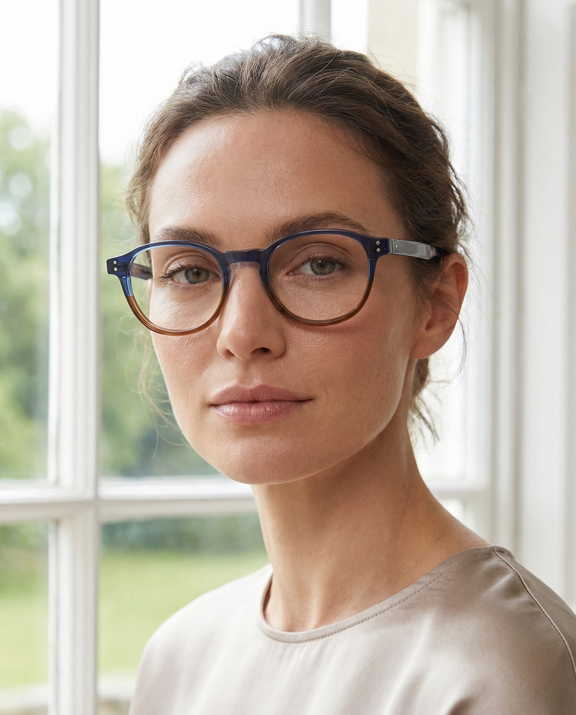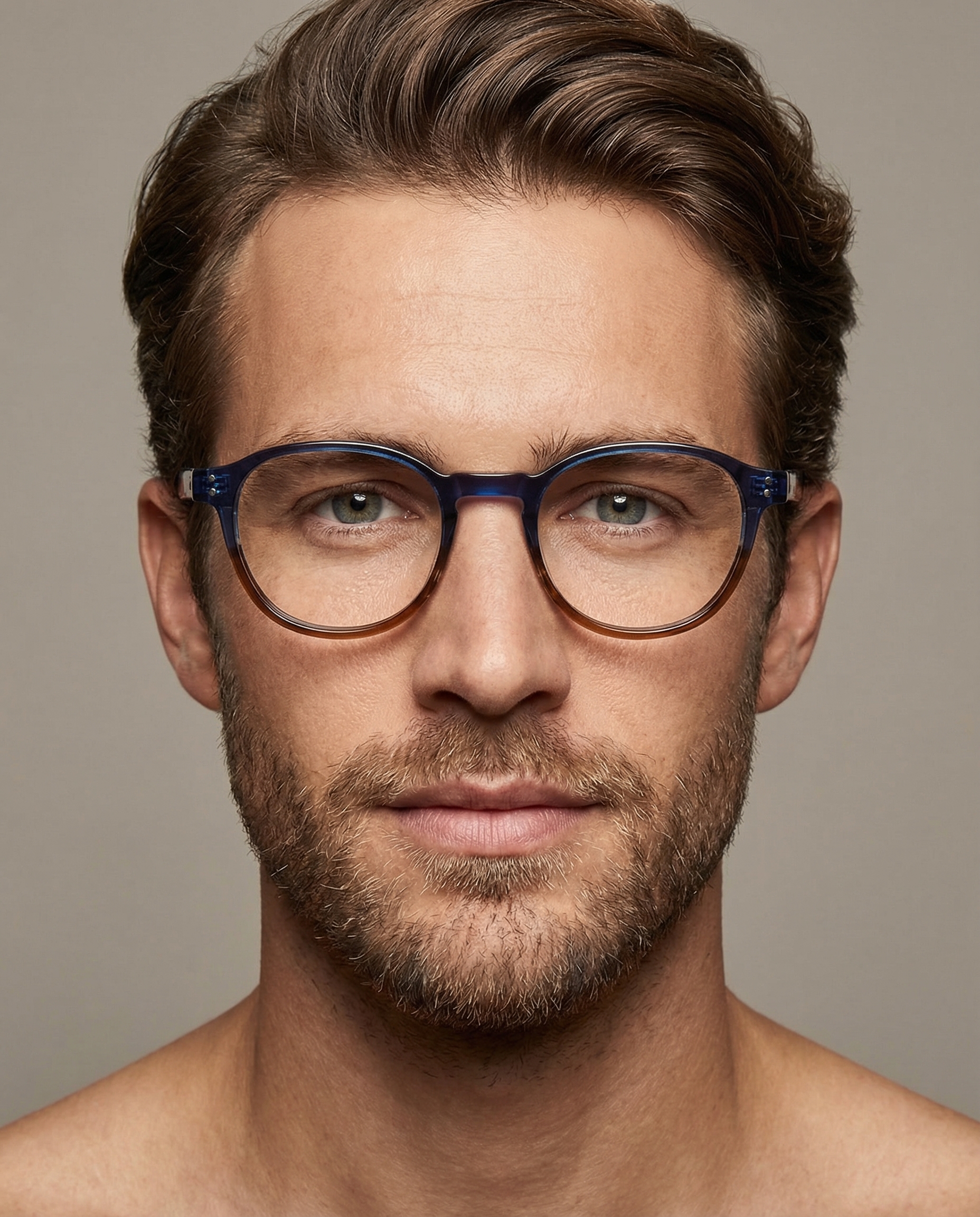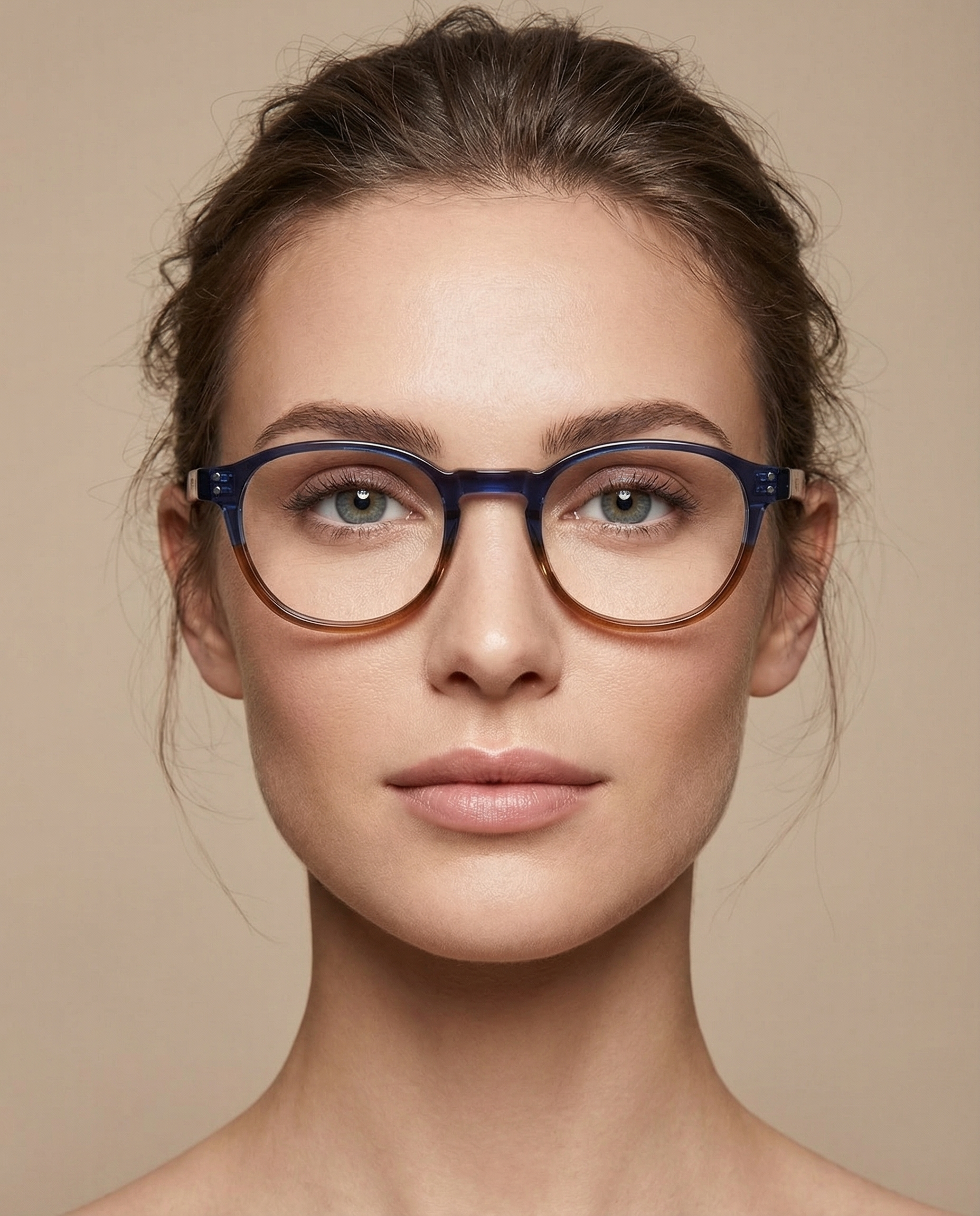 Modna plastična unisex korekcijska očala. Primerna za vsakdanje nošenje. Zgoraj nežno modrikasta barva, v spodnjem delu okvirja rahlo rjava. Zahvaljujoč širokemu nosnemu mostu, širokemu 21 mm, se kot ulitek prilega večini obrazov. Z nakupon tega okvirja, dobite tudi moden trdi etui, ki bo zasčitil vaša očala.